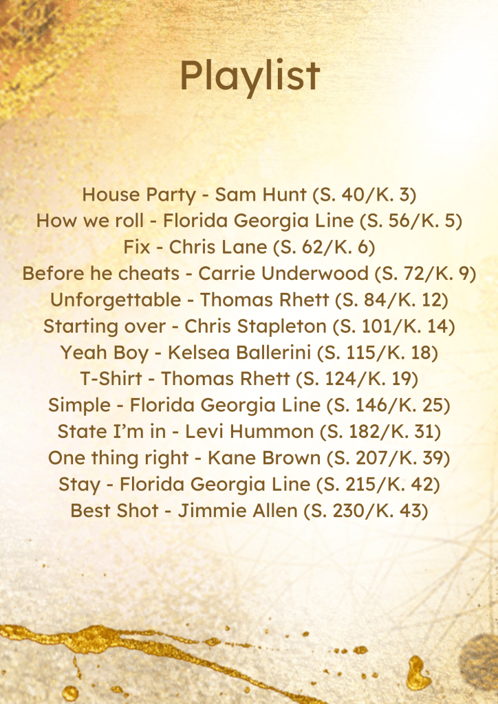 Die Playlist passend zum Buch findest du auf Apple Music und Spotify. Damit du auch weisst, zu welcher Seite oder Kapitel des Buches die Lieder passen, findest du hier eine Übersicht:
